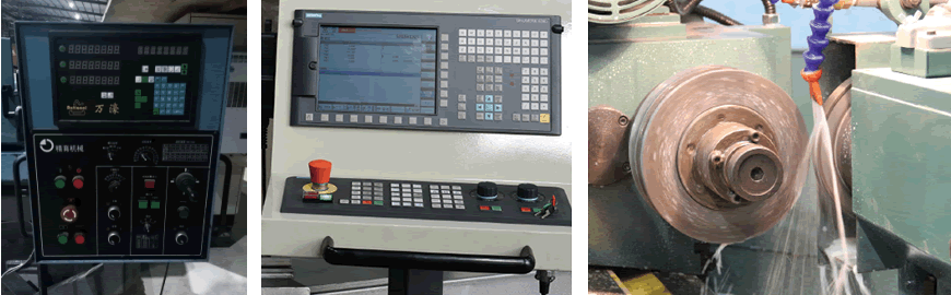 数控式机床采用西门子数控系统,分别控制砂轮架进刀和工作台移动,砂轮架和工作台的位置通过电机编码器的准确反馈 ,在编制好磨削程序后后,程序可以自动完成辊面外圆及各孔型槽的磨削。